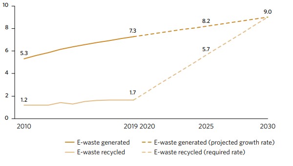 Dei 7.3kg di rifiuti di apparecchiature elettriche ed elettroniche (RAEE) per capita prodotti a livello mondiale (saranno 9kg nel 2030) nel 2019, soltanto 1.7kg sono stati smaltiti in maniera sostenibile. I RAEE sono aumentati del 20% nel periodo 2014-2019, arrivando a quota 53.6 milioni di tonnellate. Il tasso di riciclo dei rifiuti elettronici dovrà aumentare di almeno 10 volte entro il 2030 per coprire l’intero loro ammontare, un processo necessario per eliminare le loro conseguenze negative che spaziano dall’inquinamento ed erosione dei suoli estrattivi con prodotti chimici velenosi in grado di causare seri danni agli umani e all’ambiente all’importante perdita di preziose materie prime come oro, litio, cobalto e platino. Basti pensare che si stima come circa il 7% di tutto l’oro nel mondo sia contenuto nei RAEE.