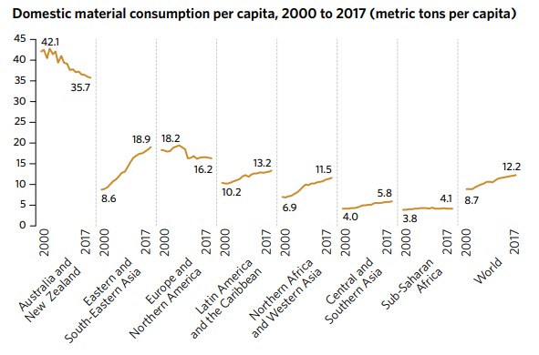 Globalmente il consumo di risorse domestico per capita è aumentato del 40% dal 2000 al 2017, trainato principalmente dalla rapida industrializzazione dei paesi emergenti anche a causa dell’outsourcing delle produzioni materia-intensive da parte delle nazioni sviluppate.