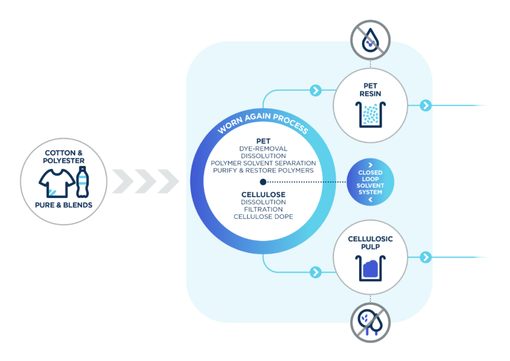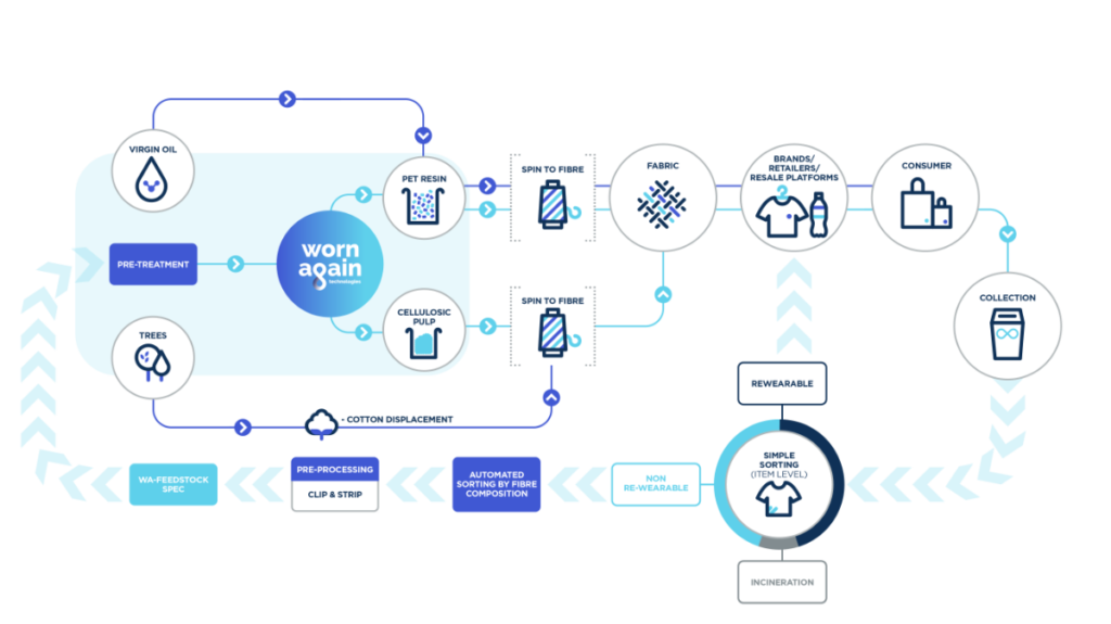 La tecnologia rigenerativa di Worn Again Technologies è l’anello mancante che consente la circolarità delle materie prime in PET e cellulosa, sostituendo l’utilizzo di risorse vergini. Il processo consente a questi materiali di essere riutilizzate all’interno di nuovi ciclo produttivi, passando dalla catena di approvvigionamento lineare a un sistema circolare, fornendo al contempo la sicurezza delle risorse sostenibile a lungo termine.