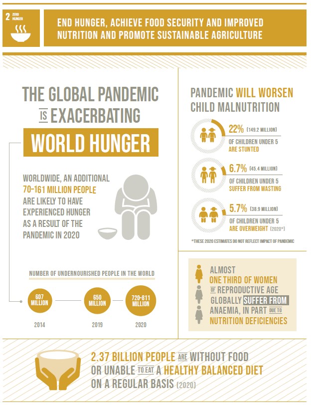 Appena prima della pandemia di COVID-19, 650 milioni di persone soffrivano la fame nel mondo e circa 2 miliardi di persone soffrivano di insicurezza alimentare – cifre in aumento dal 2014. La crisi ha posto ulteriori minacce alla sicurezza alimentare e alla nutrizione globale: catene di approvvigionamento alimentare interrotte e rallentamenti economici hanno colpito i sistemi alimentari in tutto il mondo e hanno minacciato l'accesso delle persone al cibo, rendendo l'obiettivo di porre fine alla fame ancora più lontano. Si prevede che il COVID-19 esacerbi tutte le forme di malnutrizione, in particolare nei bambini, a causa della perdita di reddito delle famiglie, della mancanza di cibo nutriente ed economicamente accessibile, una ridotta attività fisica e interruzioni dei servizi nutrizionali essenziali.