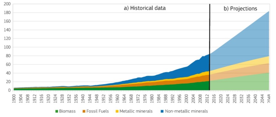 Dato che l’attuale andamento di estrazione delle risorse del nostro pianeta risulta insostenibile (negli ultimi 30 anni abbiamo consumato 1/3 delle risorse della Terra), in quanto consumiamo materie prime più di quelle che possiamo utilizzare a una velocità maggiore della loro stessa rigenerazione (figura 1), l’economia circolare può essere la chiave per riuscire a ridurre il nostro impatto ambientale sul pianeta.
